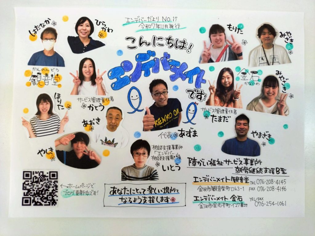 という訳で、新しいエンデバーだよりが出来ました。今回は職員の紹介と観音堂のバーベキューイベント、金石のお仕事の紹介です✌機会があれば手に取ってみてください。