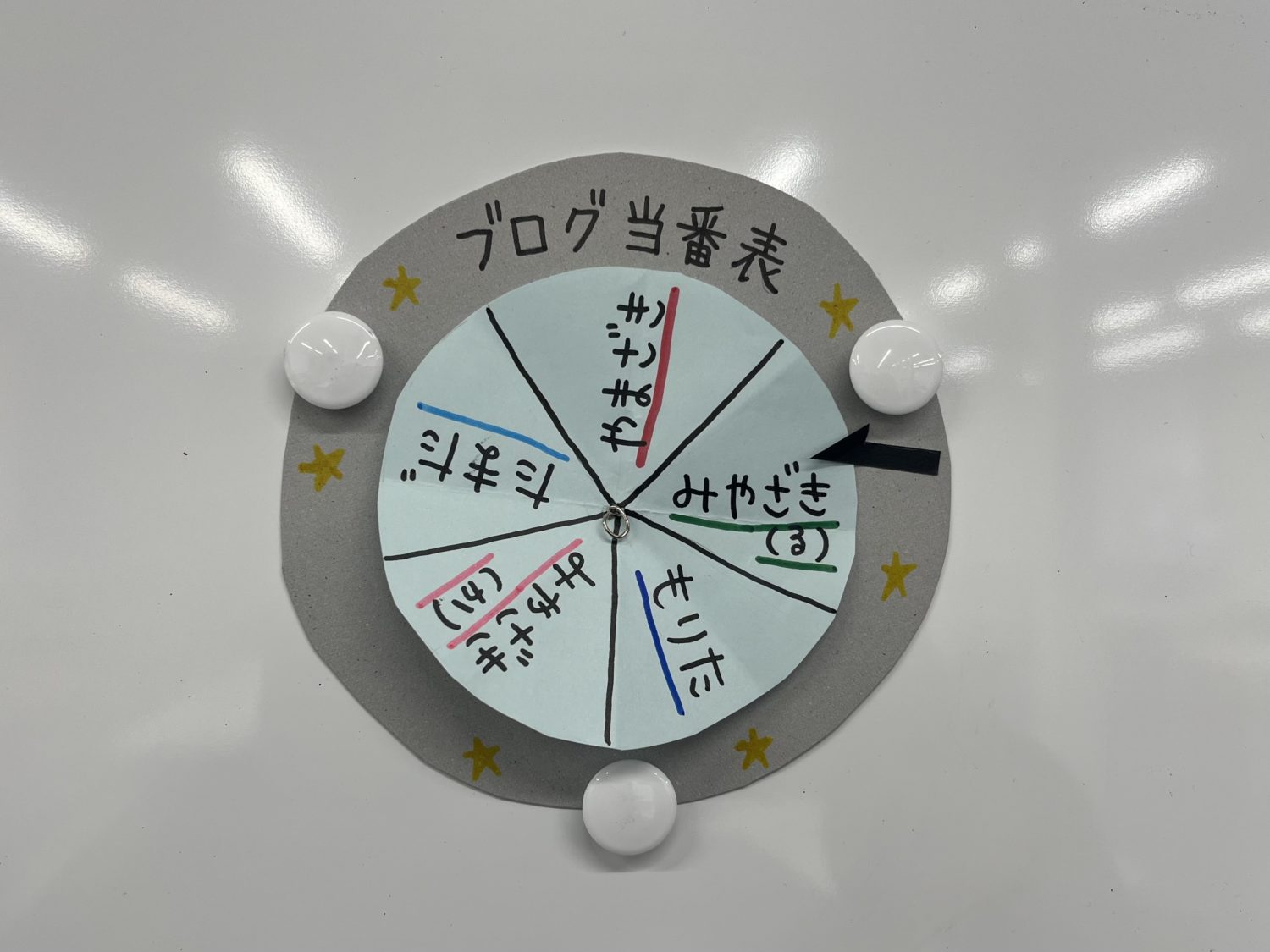 ブログ当番表です✨その週の担当の人は、ブログを投稿したら反時計回りに動かして次の人に矢印が向くようにします。毎日必ず目にするホワイトボードに貼りました!これで忘れない😊